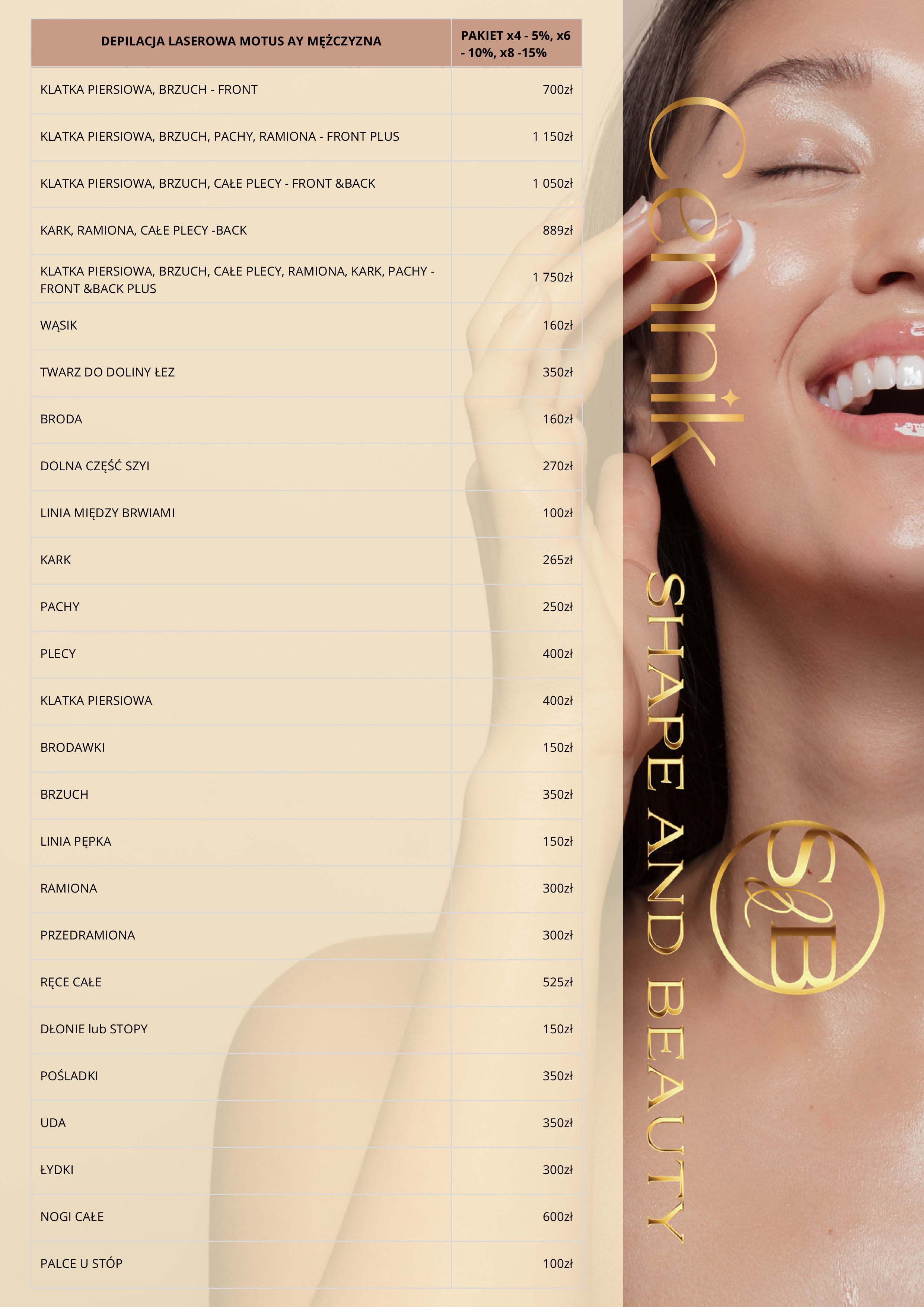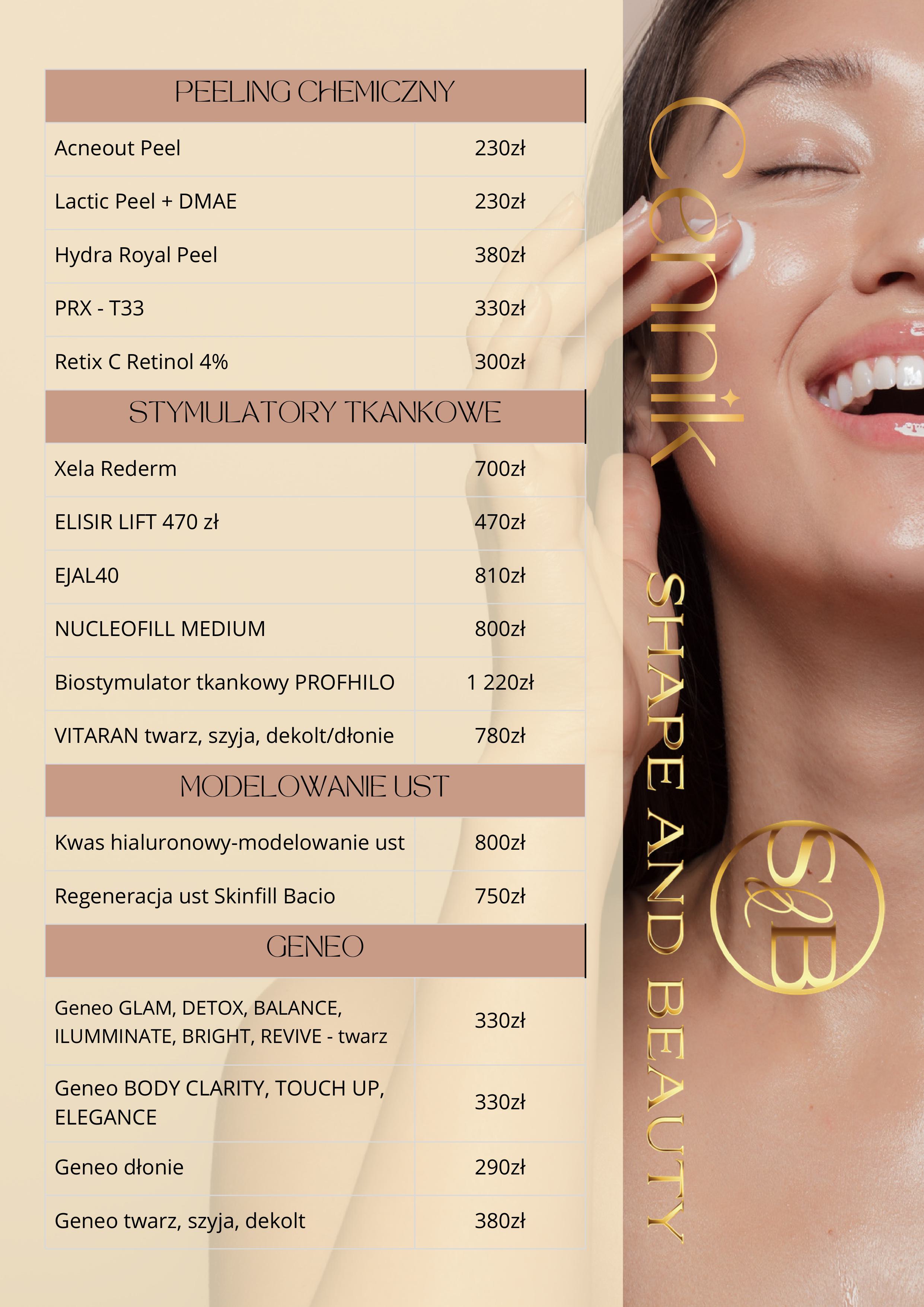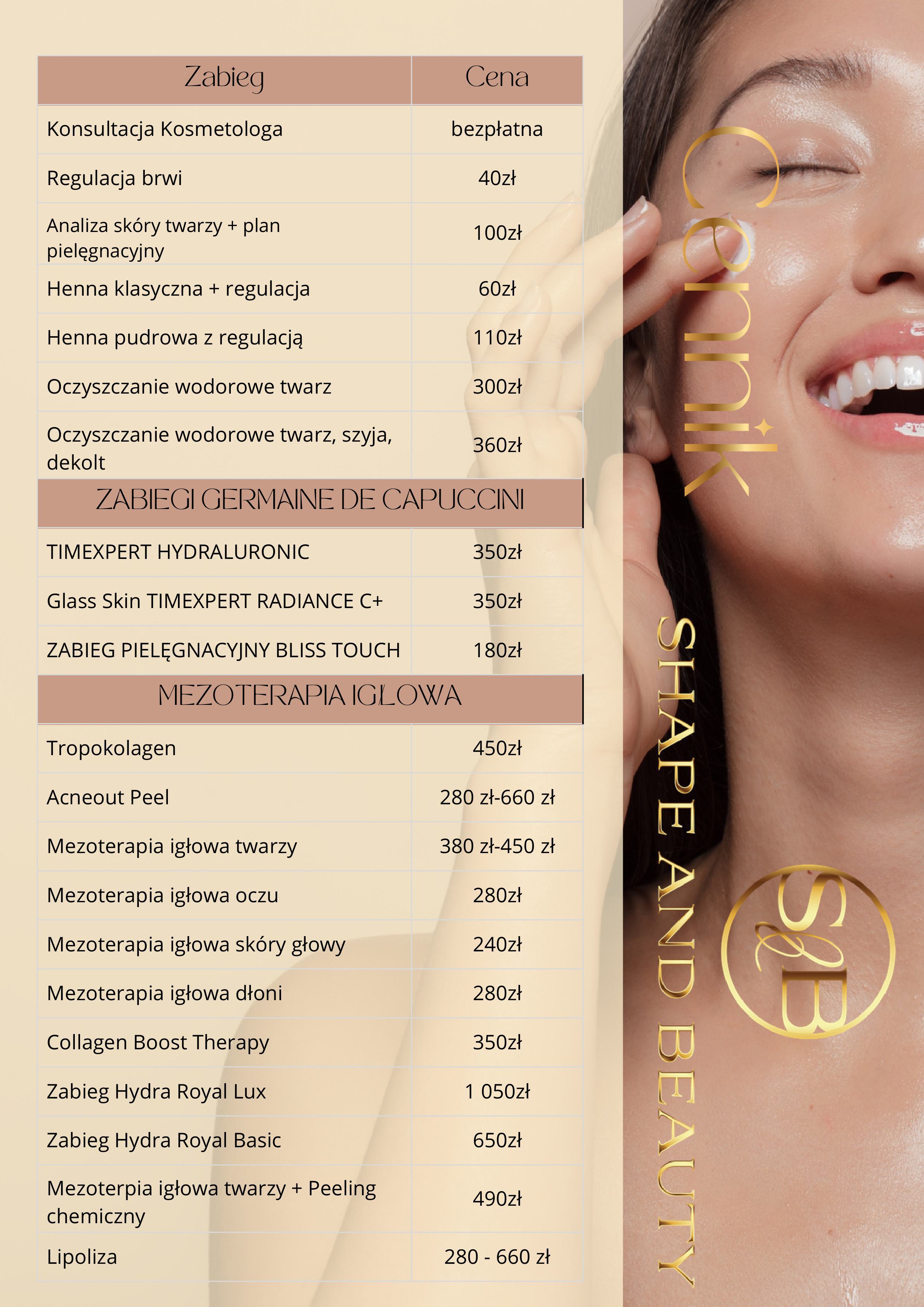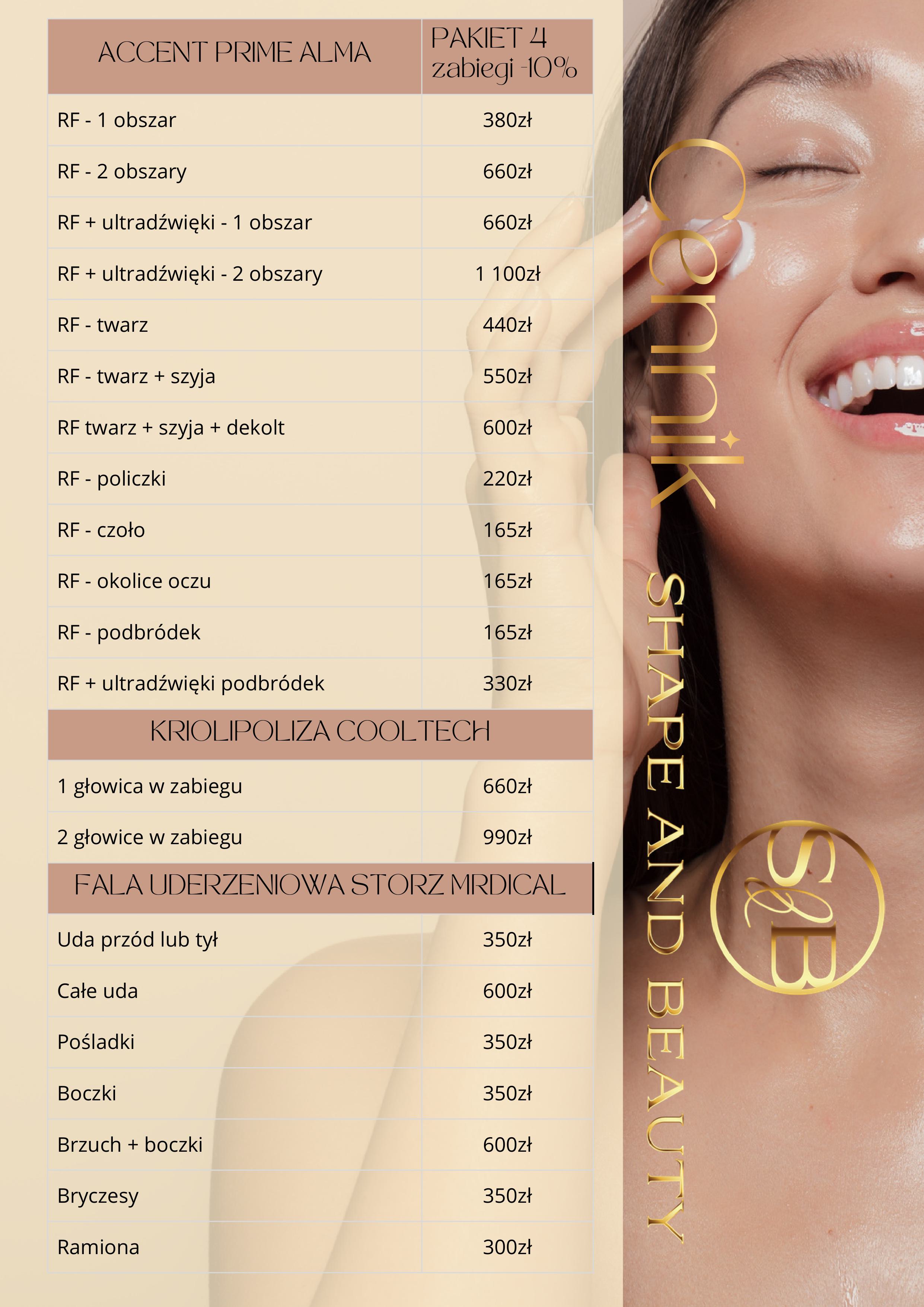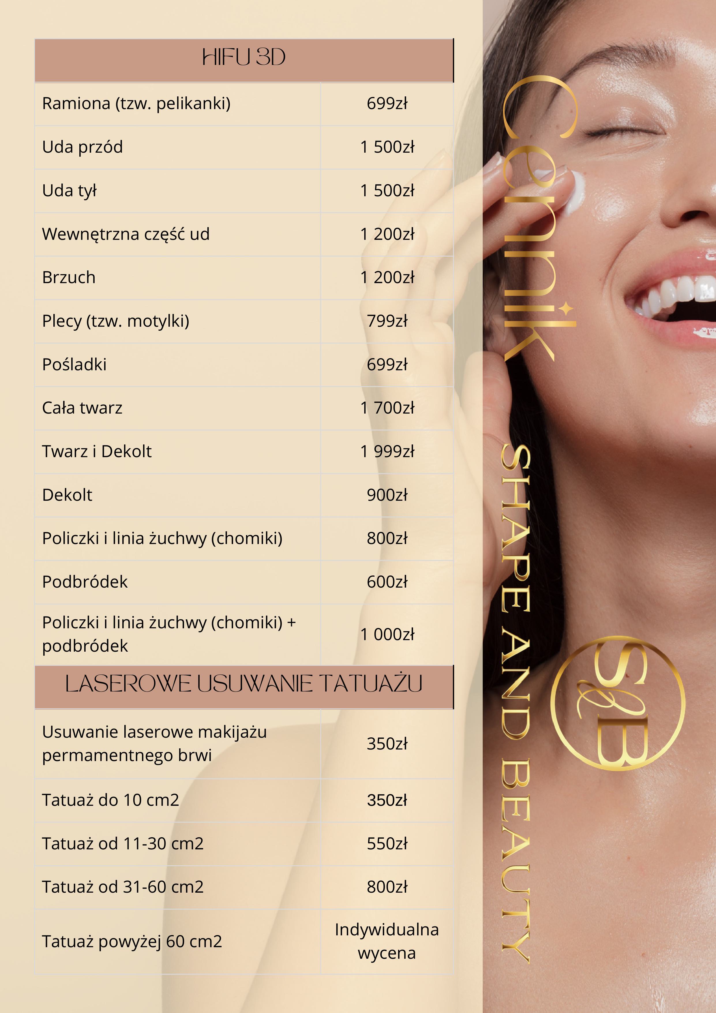 W Shape and Beauty stawiamy na transparentność. Dlatego też prezentujemy Ci nasz cennik, który pozwoli Ci zaplanować swoje wizyty i zabiegi. Znajdziesz tu szczegółowe informacje o kosztach poszczególnych usług, które oferujemy.