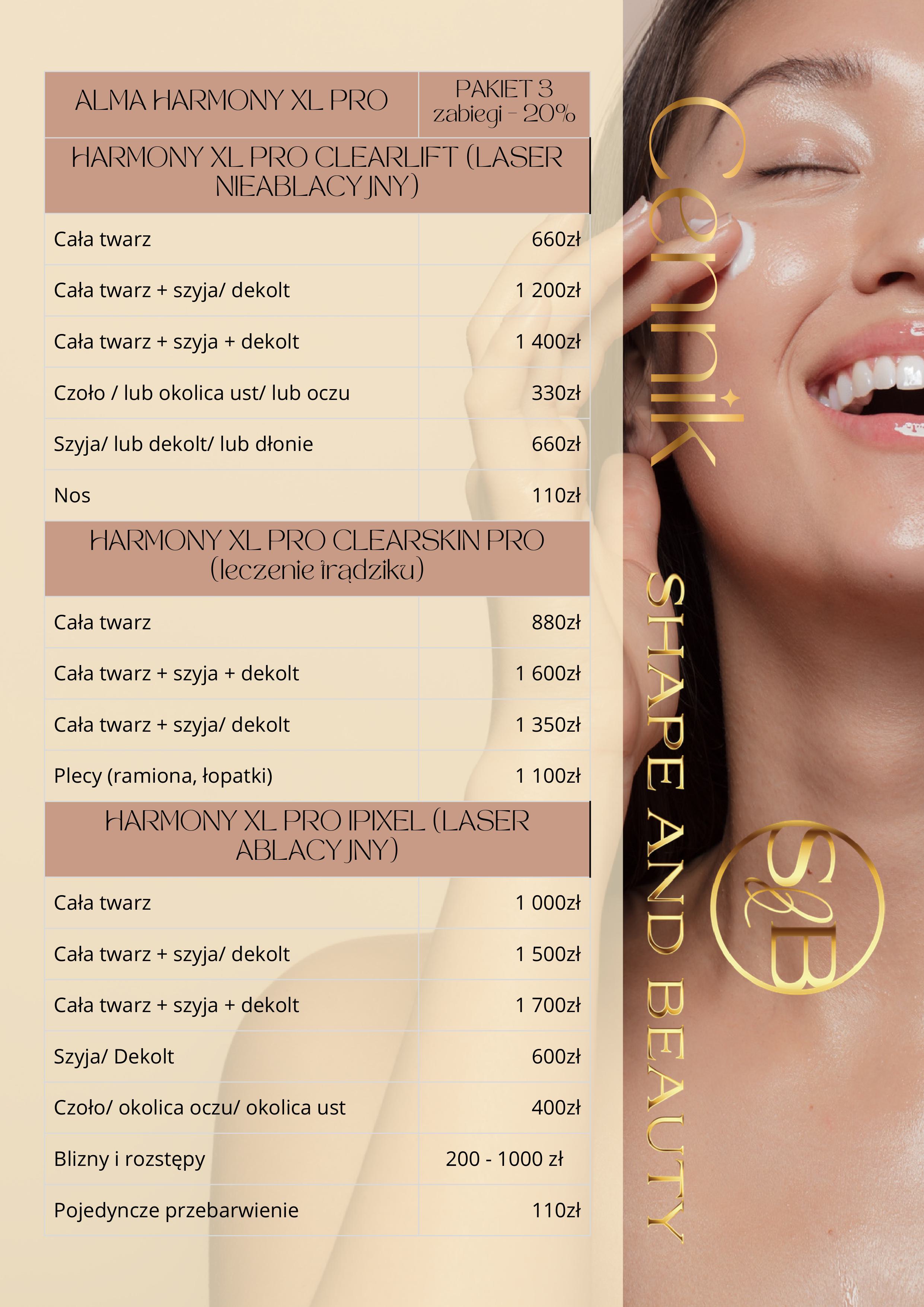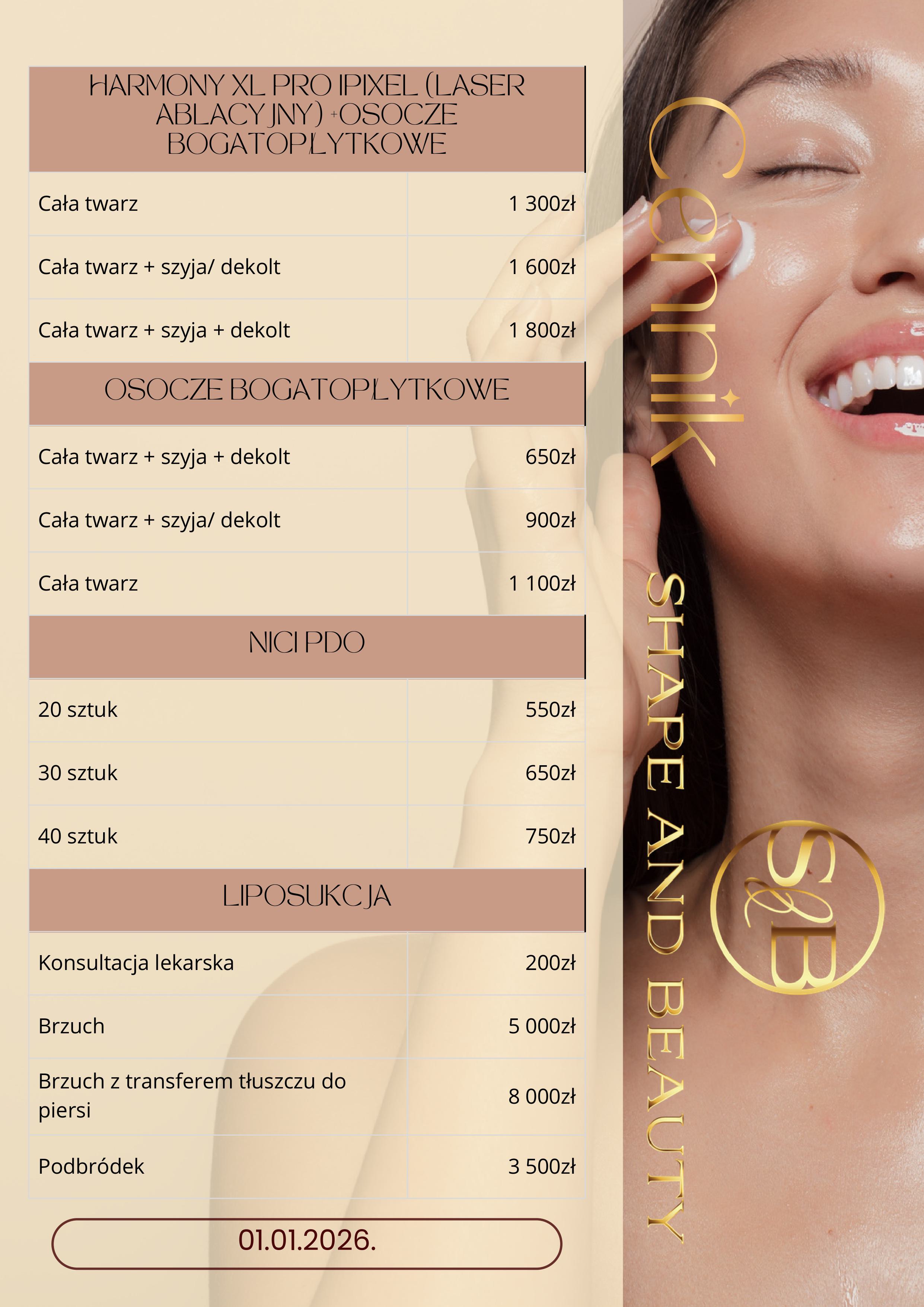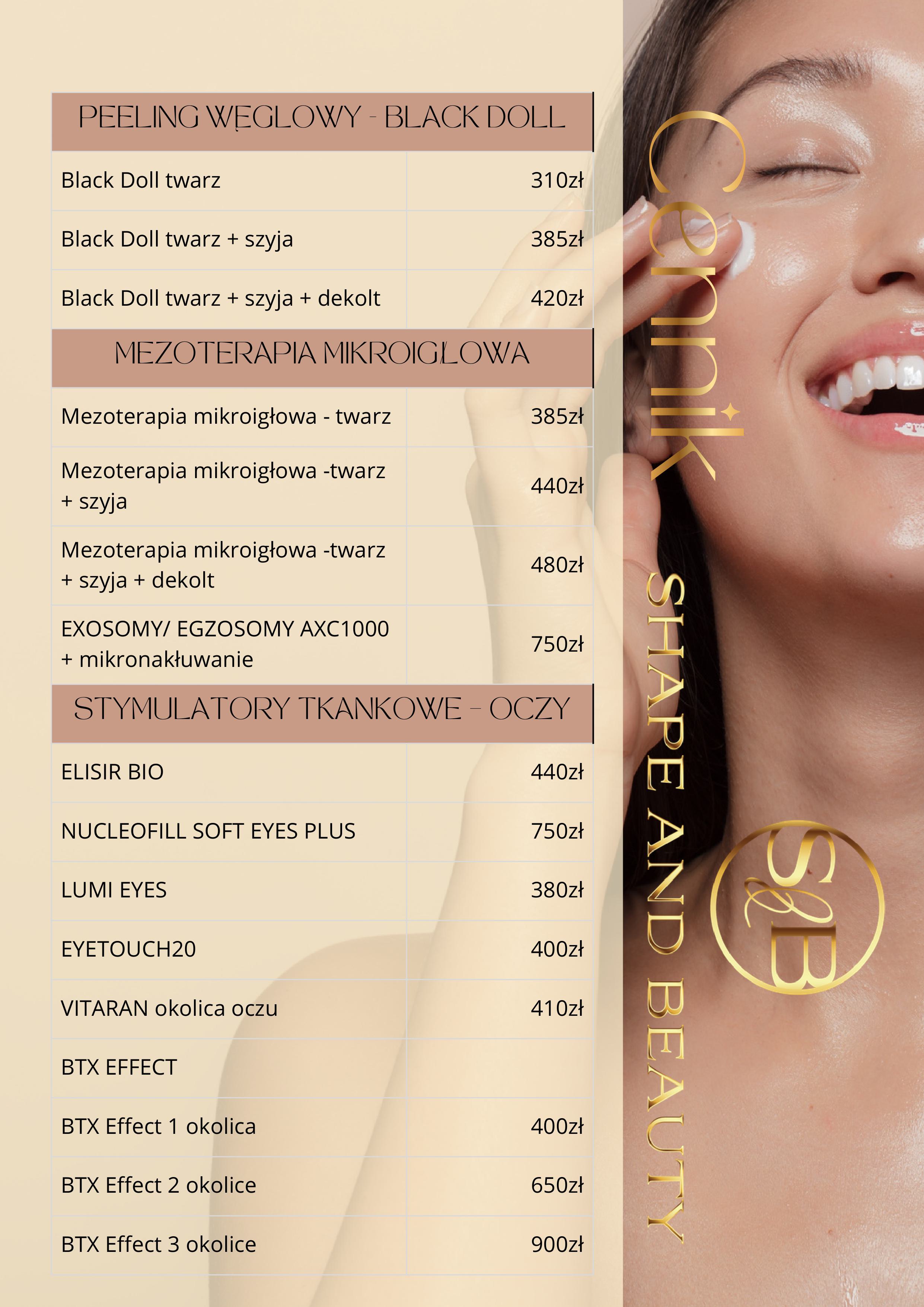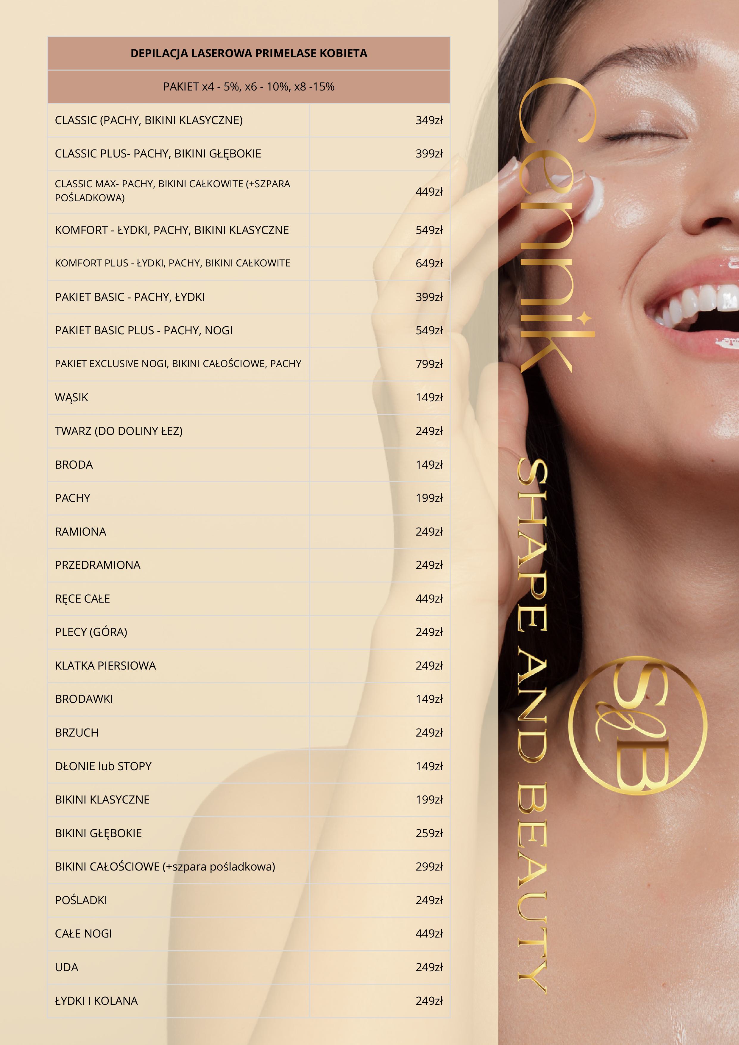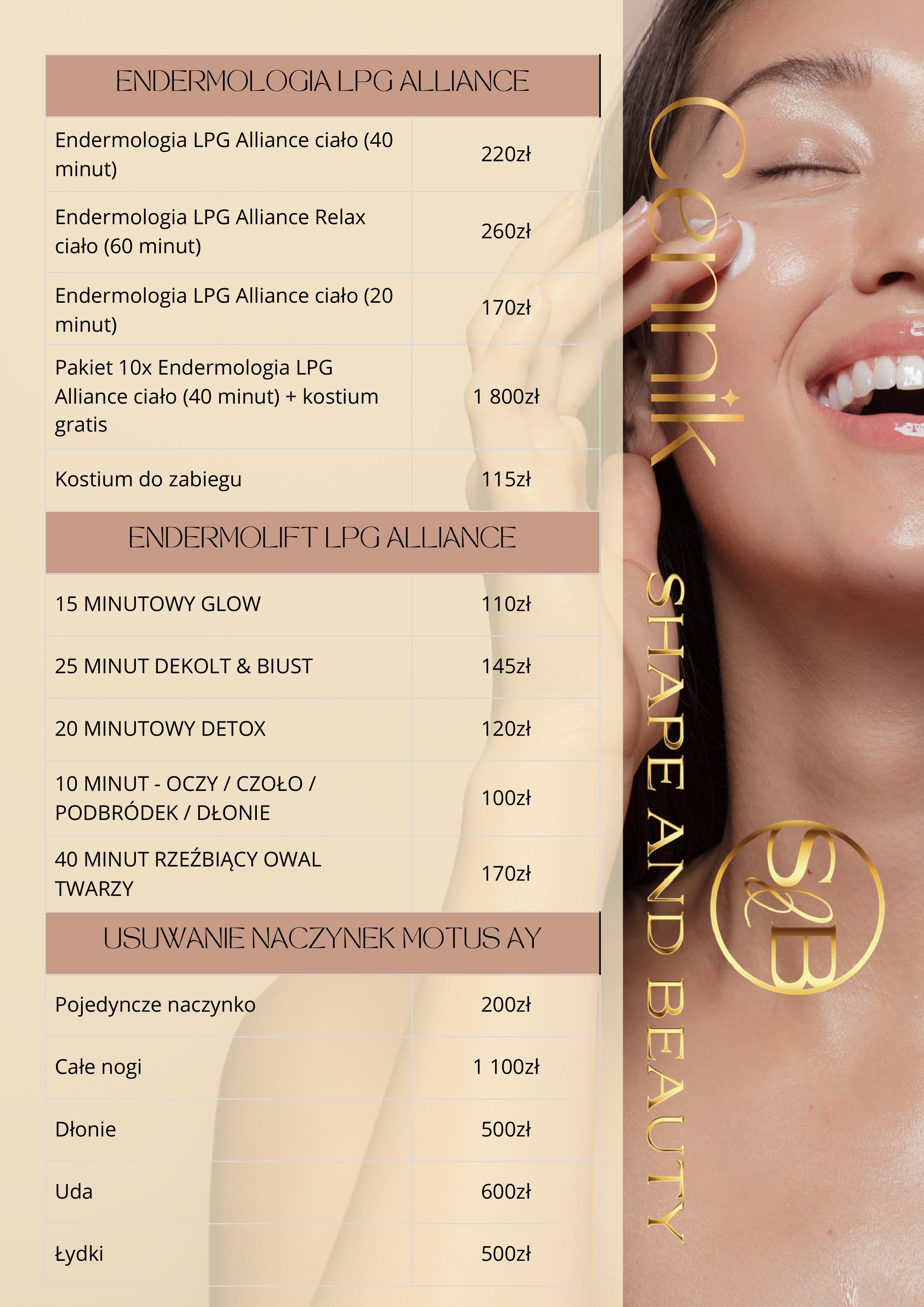 W Shape and Beauty stawiamy na transparentność. Dlatego też prezentujemy Ci nasz cennik, który pozwoli Ci zaplanować swoje wizyty i zabiegi. Znajdziesz tu szczegółowe informacje o kosztach poszczególnych usług, które oferujemy.